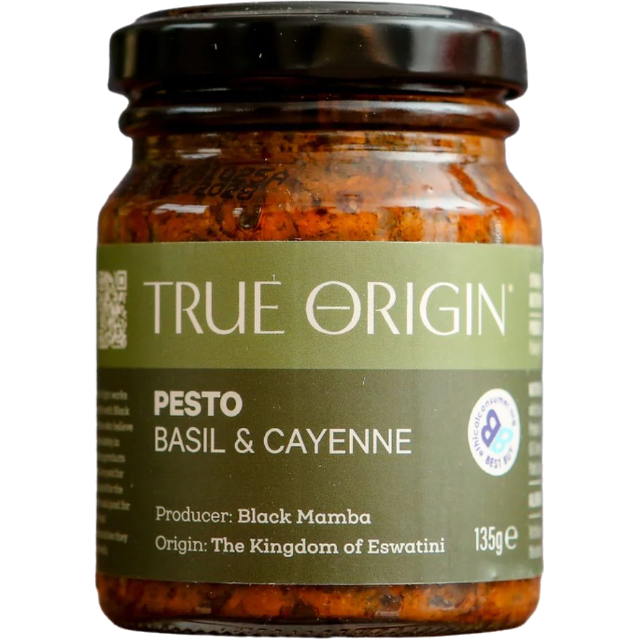 Fresh, fiery, and full of flavour, True Origin Basil & Cayenne Pesto is a bold twist on the classic, made in Eswatini by our fair trade supplier, Black Mamba. Crafted in small batches using fragrant basil, zesty cayenne chillies, and all-natural ingredients, this herby chilli pesto for pasta and veg brings a perfect balance of freshness from the basil and subtle lasting heat.
