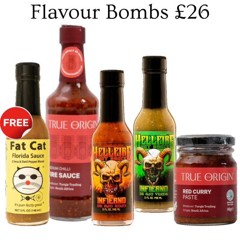Four heat-packed essentials from my 'Around the World' collection with a hint of garlic and citrus: Hellfire's Infierno sauces, True Origin/Turqle Trading's Fire Sauce - a big 240ml bottle and their Yellow Curry Paste + Fat Cat Florida Sauce* (FREE)